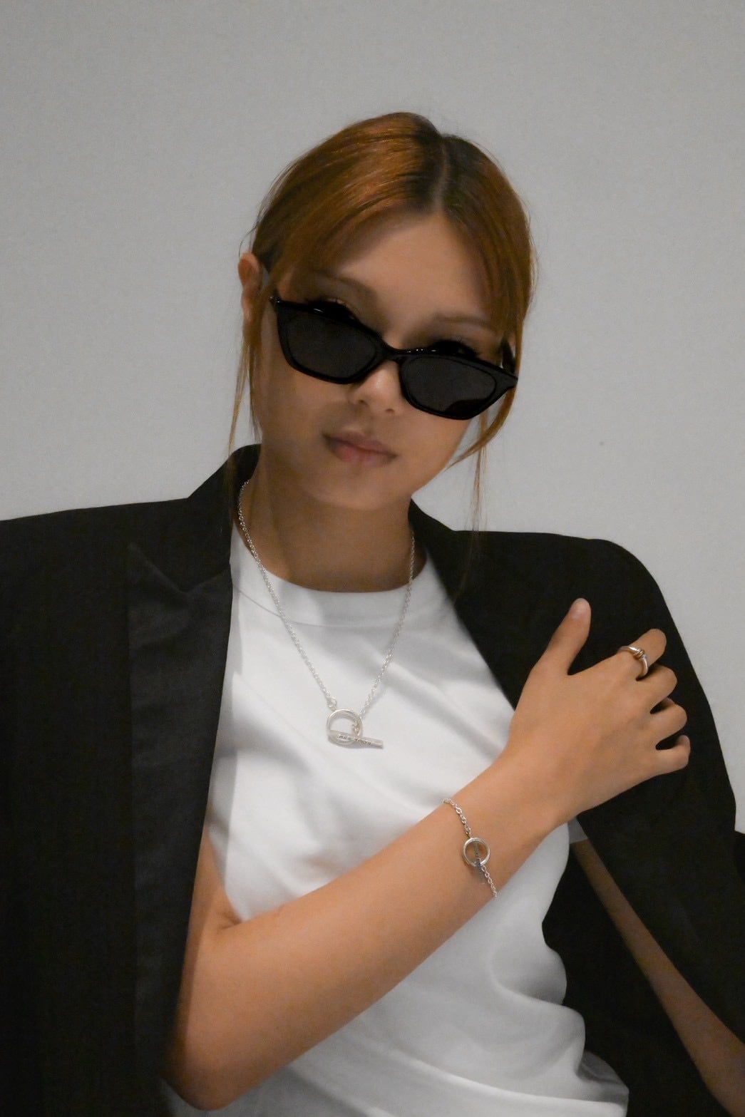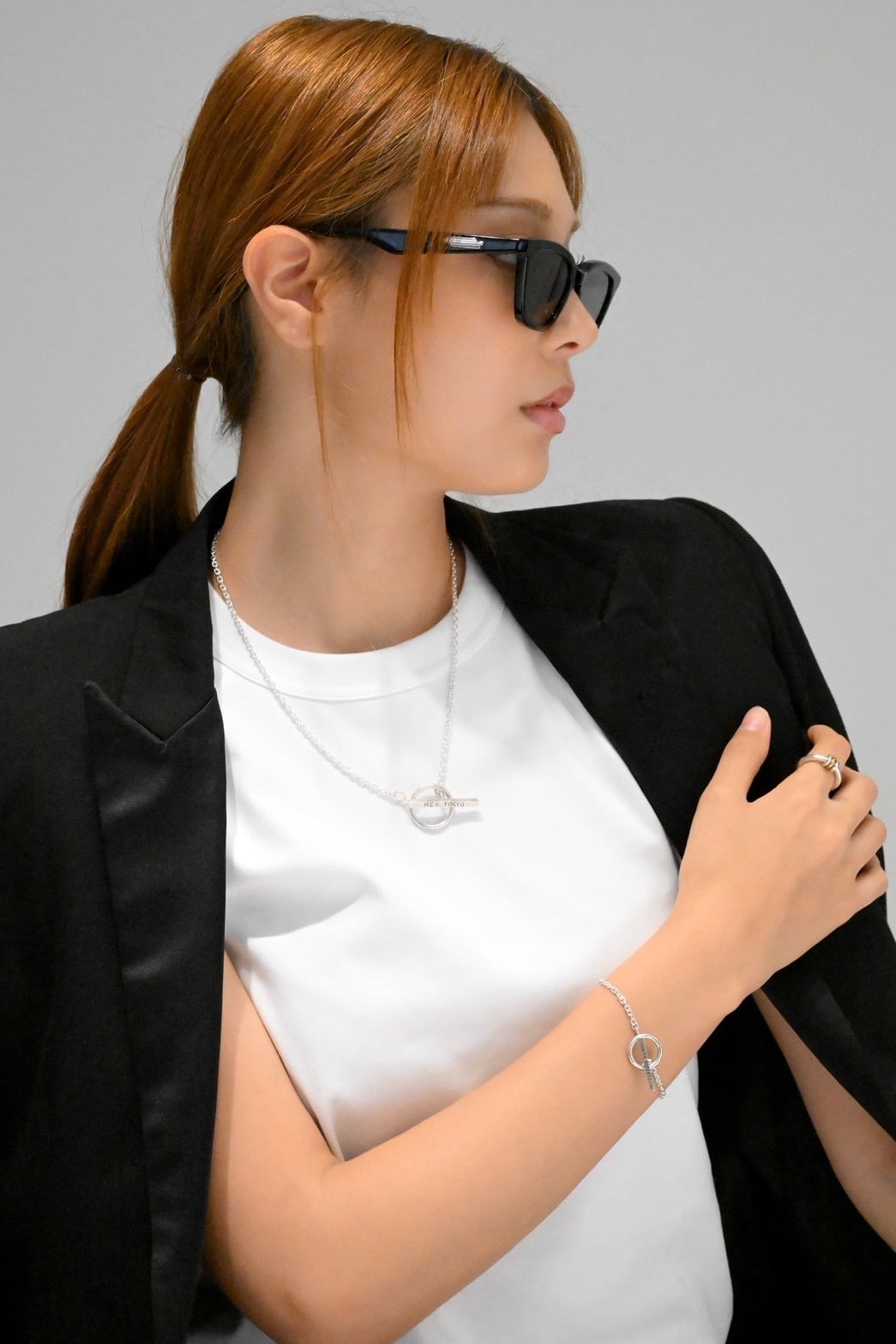 着用時には胸元で存在感のあるバー部分が