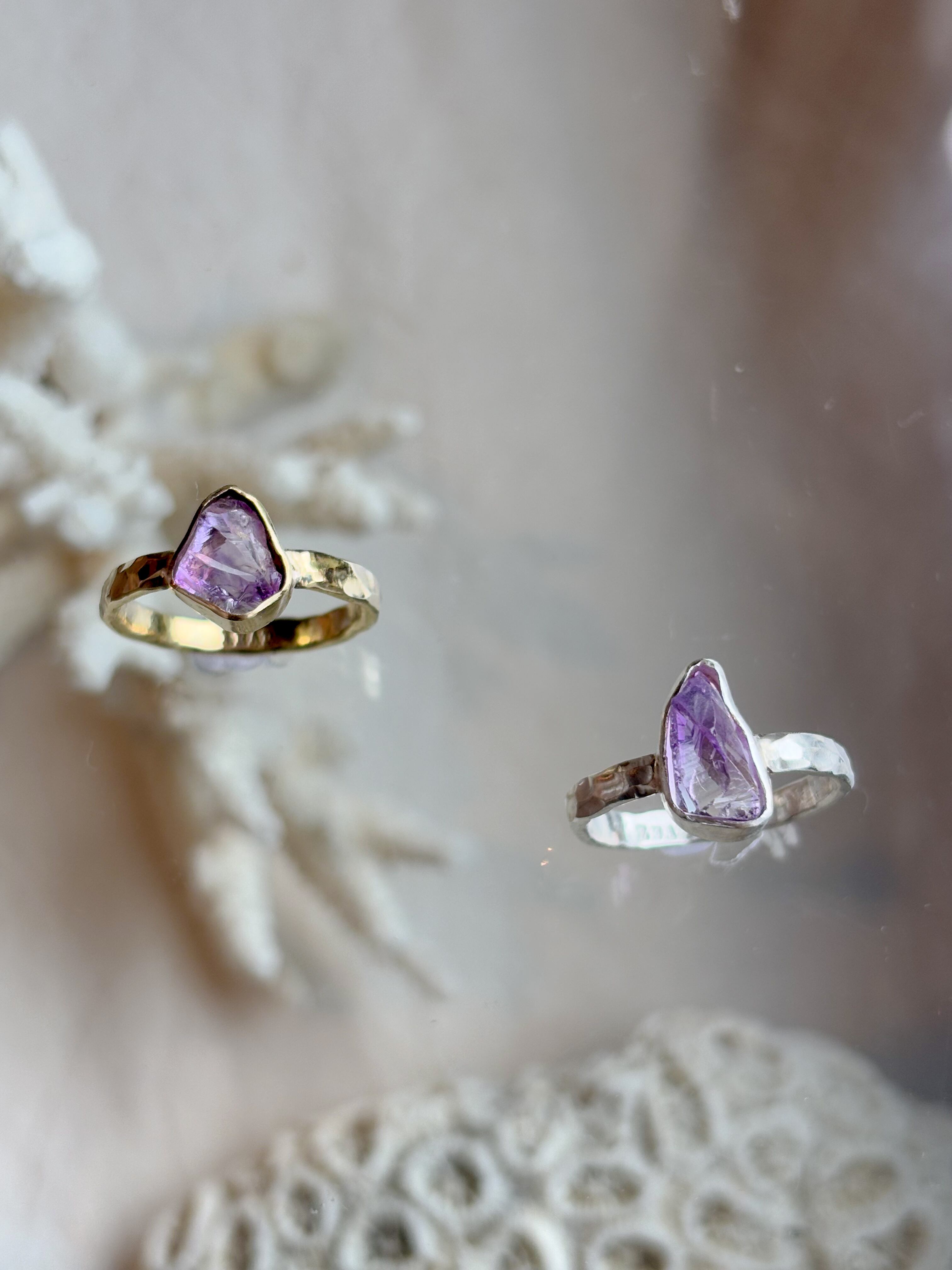 リング部分は、アメジストをしっかり支えるためのデザインになっており、天然石の美しさが引き立つように作られています。特別な日のお出かけや、普段使いのアクセントとしても活躍してくれるアイテムです!